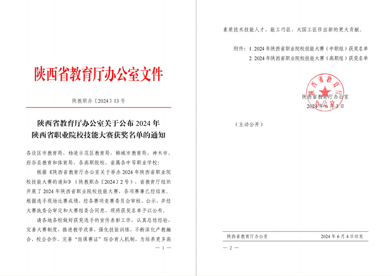 近日,陕西省教育厅公布了2024年陕西省职业院校技能大赛(以下简称“省赛”)获奖名单。我校师生精诚协作、力战群雄、荣获省一等奖16项、二等奖26项、三等奖8项,共计50个奖项的喜人成绩,获奖总数再创新高,取得学校历史最好成绩。这些成绩的取得,彰显了我校办学实力与水平。